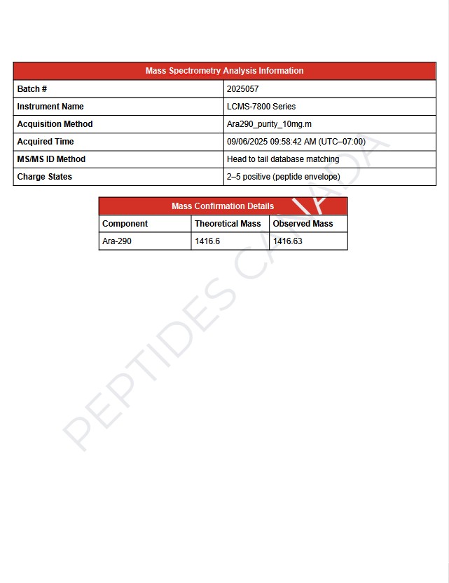 Ara-290 is a short synthetic peptide engineered to selectively activate specific EPO receptor pathways. Due to variable peptide manufacturing parameters, a single definitive molecular formula is not listed. Batch identity is confirmed analytically.
