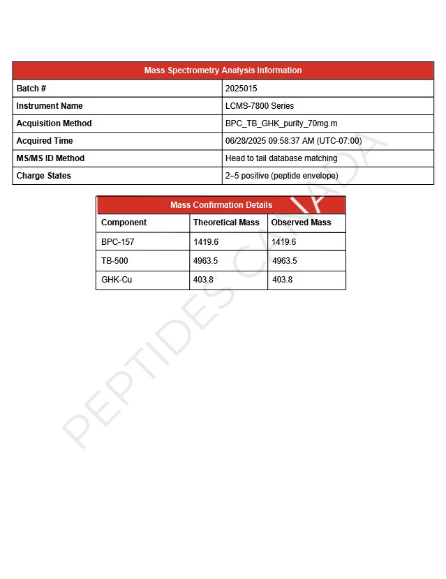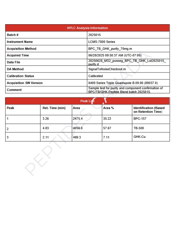 - Blend Total: 70mg per vial (BPC-157 20mg, TB-500 40mg, GHK-Cu 10mg)