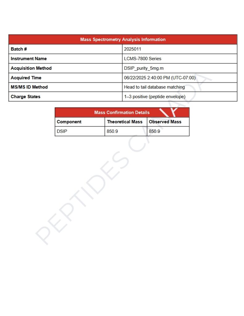 This batch of DSIP (Delta Sleep-Inducing Peptide) has been third party lab tested and verified for quality. Size: 5mg Contents: Delta Sleep-Inducing Peptide Form: Powder Purity: 99.0%