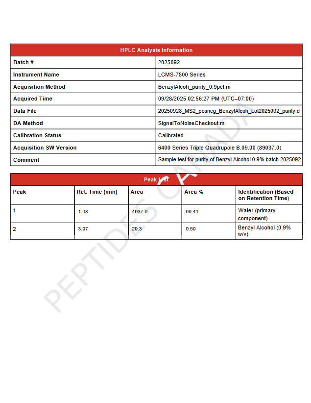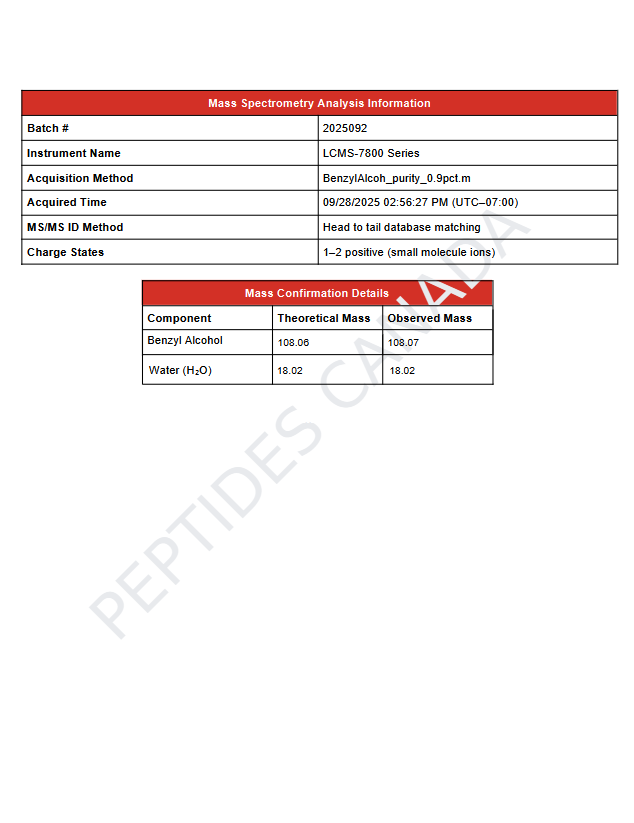 This solution contains benzyl alcohol (C₆H₅CH₂OH) at 0.9% (v/v) within ultra-pure water. A precise molecular formula for the diluted system is not applicable. Analytical verification for this batch confirms identity, concentration, and sterility.