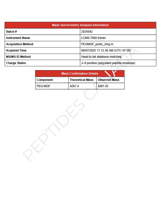 PEG MGF (Batch # 2025012) has been confirmed via LCMS to have a mass of 4,230.5 Da and via HPLC to be 98.73 % pure. These analytical values verify high sample integrity and suitability for controlled research-use applications. PEG MGF remains for investigational laboratory use only and is not intended for therapeutic or diagnostic use in humans or animals.